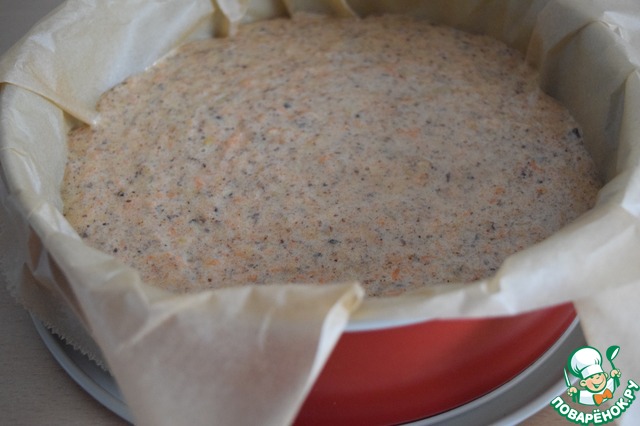 Форму - диаметр 26-28 см ( у меня 26 см ) застилаем бумагой для выпечки и выливаем наше тесто.
