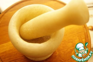 В ступке перетираем соль с сушеными розмарином и тимьяном