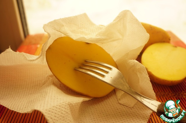 Картофель разрезаем пополам и промакиваем бумажными полотенцами