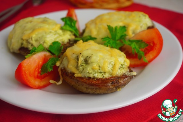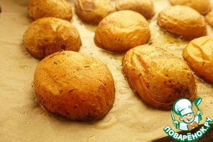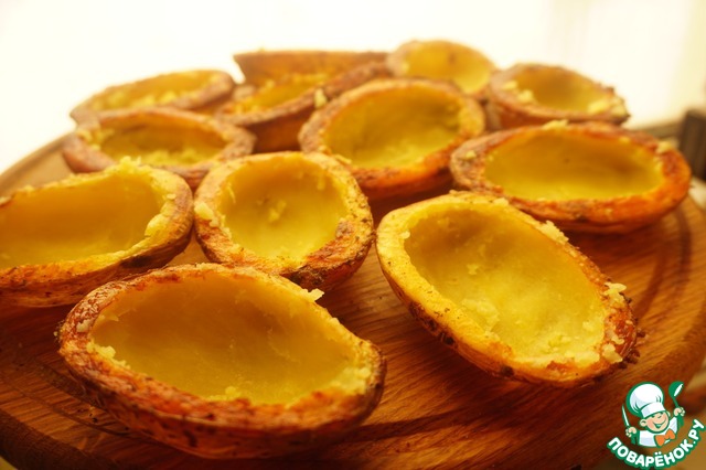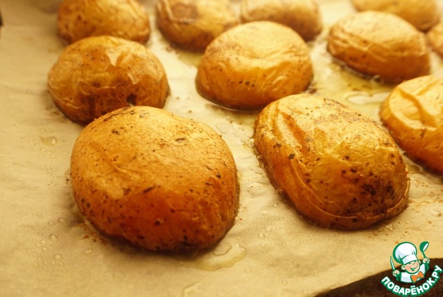 Выкладываем картофель срезами вниз на застланный пергаментом противень и отправляем в разогретую до 200 градусов духовку на 30-40 минут.