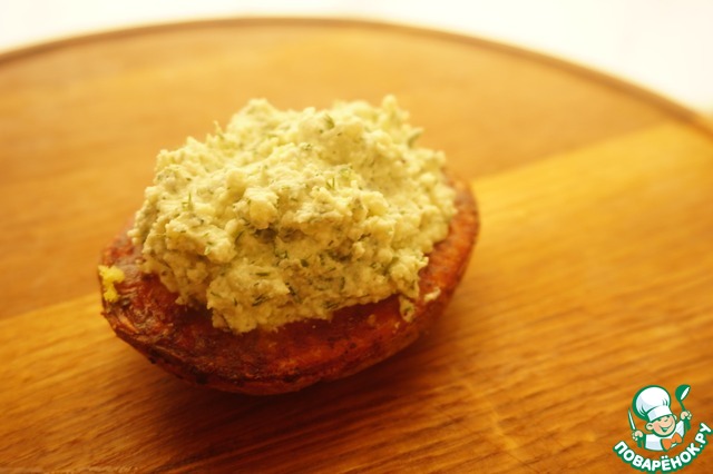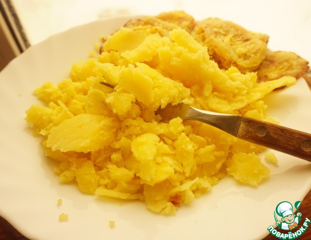 Извлеченный картофель хорошо разминаем вилкой или толкушкой и смешиваем с брынзовой начинкой.