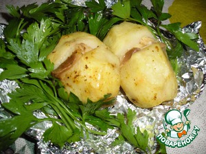 Запекаем при температуре 200 градусов 30 минут. Готовность проверяем, протыкая палочкой либо вилкой. Величина картофелины влияет на время томления в духовке и размеры поглощённого картофелиной кусочка сала.