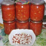 Готовую массу довести до кипения, добавить сахар, соль, душистый перец и лавровый лист, растительное масло и проварить с момента закипания 20-25 минут. Добавить фасоль, варить еще 15 минут, влить уксус и варить 10 минут. Удалить лавровый лист. Горячим разложить по банкам, закупорить, остудить "под шубой". Хранить в прохладном месте. Выход 6 л.. Эту заготовку можно добавить в бульон и сварить суп, подать как гарнир к мясу или как закуску на общий стол. Отцедив фасоль от соуса, Вы получите отличную добавку в салат. Ну, а в пост - это просто незаменимо, скажу больше, необходимо.