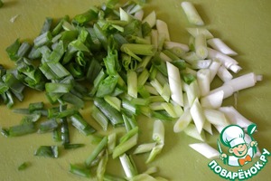 • Разбить в миску 2 яйца, добавить по вкусу соль, перец, 1/4 часть лука, взбить вилкой. Обжарить омлет. Отставить в сторону остывать.