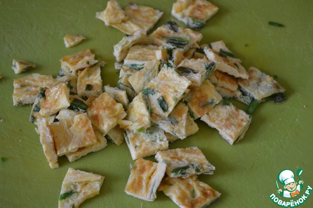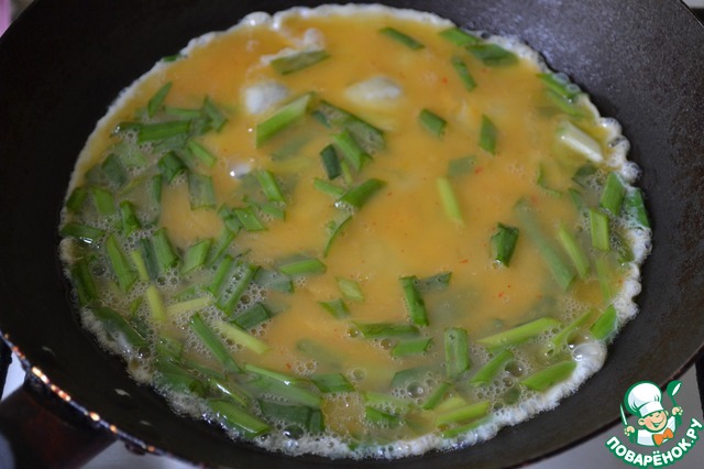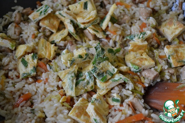 • Добавить в сковороду рис, кусочки омлета, готовить пару минут.