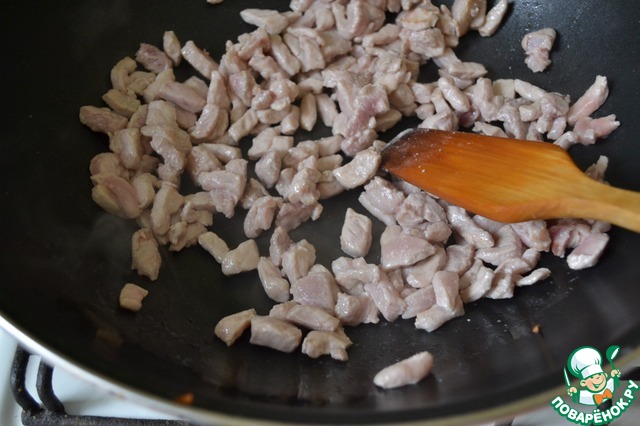 • Прибавить огонь, обжарить свинину в течение минуты.