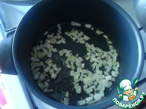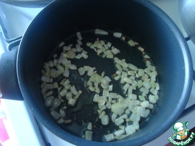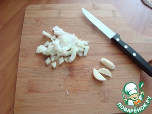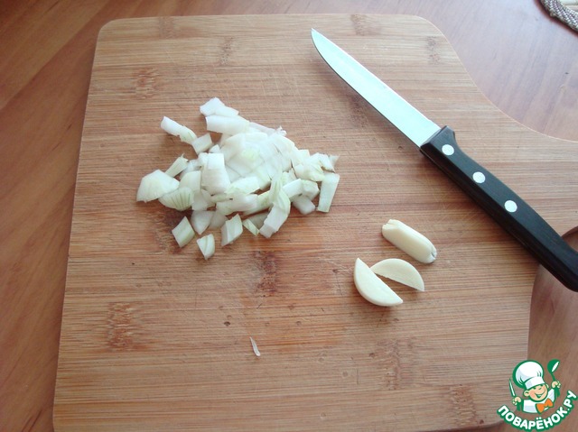 • Лук мелко порезала. Один зубчик чеснока разрезала на дольки.