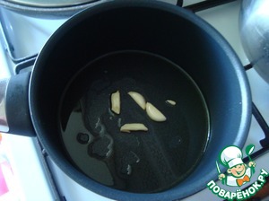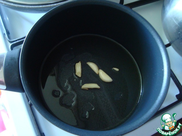 • Налила в сковороду оливковое масло, разогрела её и выложила в масло дольки чеснока. Сделала до тех пор их, пока они не отдали аромат свой маслу. Вынула их.