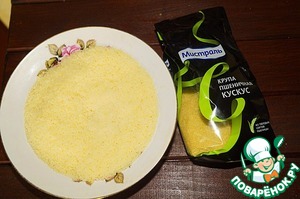 Кус-кус залить кипятком в соотношении 1:2, оставить на 5 минуту. Затем разрыхлить вилкой.