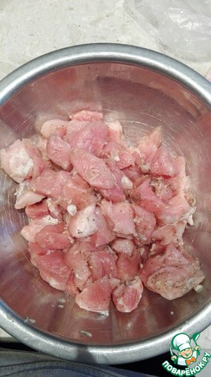 0,5 кг мяса порезать кусочками, посолить поперчить, добавить 3 зубчика чеснока и поставить в холодильник на 2 часа.