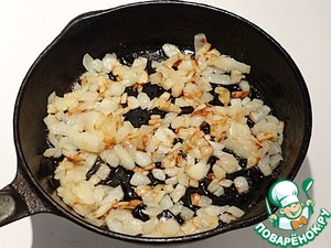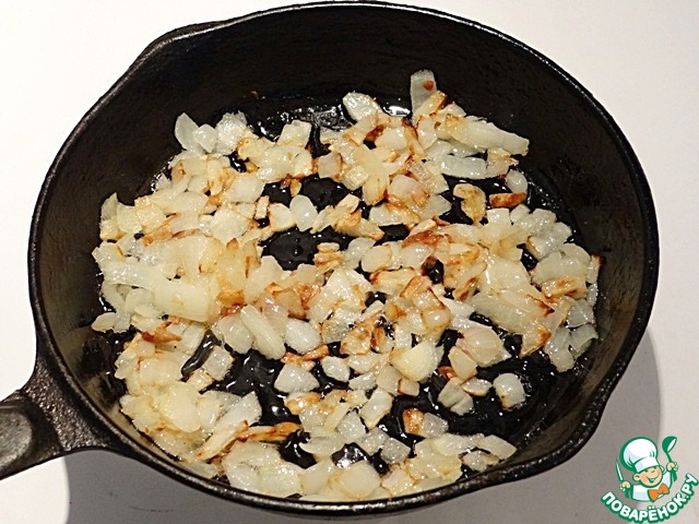 • Нарезанный на маленькие кубики репчатый лук обжариваю на сковороде до мягкости.