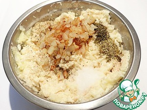 • К начинке для вареников добавляю обжаренный лук, соль и перец черный молотый по вкусу, тимьян и орегано.