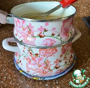 Нагревайте водяную баню, параллельно взбивая венчиком массу до полного растворения сахара. 5 - 7 минут.
