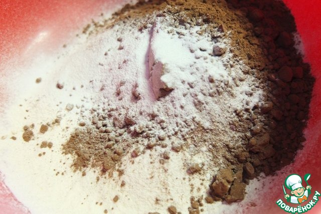 Просеиваем в миску муку, какао-порошок и разрыхлитель.