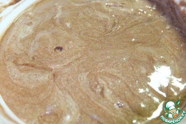 В два приема вводим просеянную муку с какао и разрыхлителем. Взбиваем миксером на небольшой скорости.