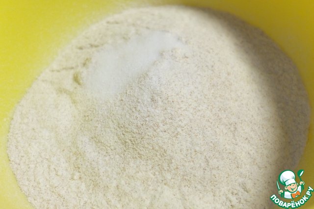 В миску просеиваем муку пшеничную и цельнозерновую, соль
