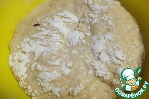 Жидкость выливаем в муку и замешиваем тесто. Присыпаем тесто мукой, накрываем полотенцем и оставляем подходить на час.