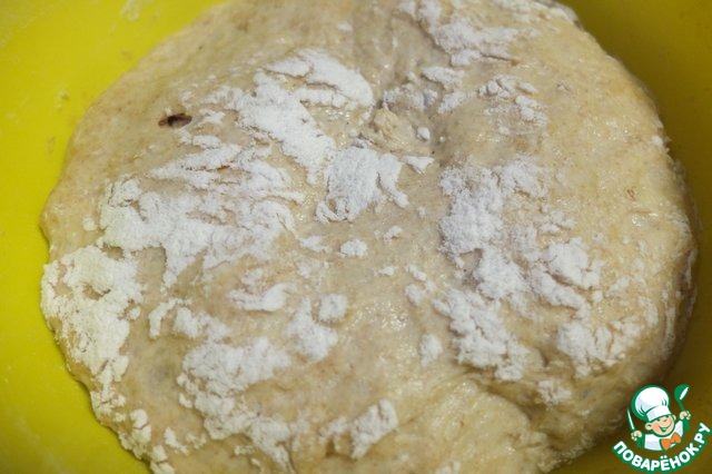 Через час тесто подошло. Тесто вымешиваем и выкладываем на рабочую поверхность.