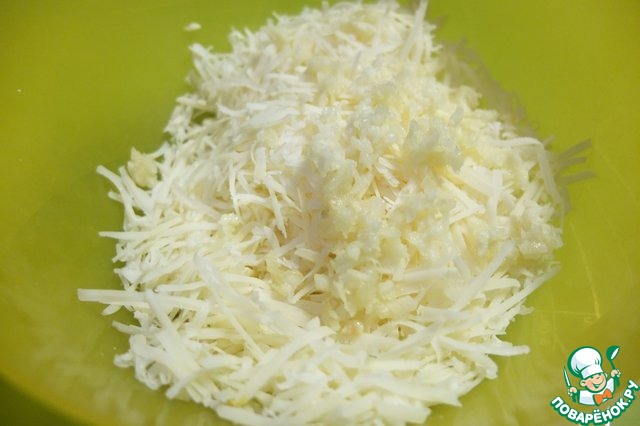Пармезан трем на средней терке, чеснок пропускаем через чеснокодавилку, смешиваем