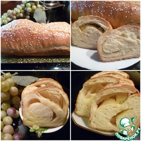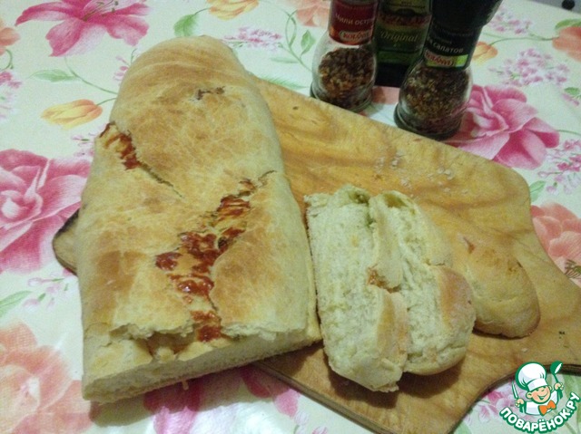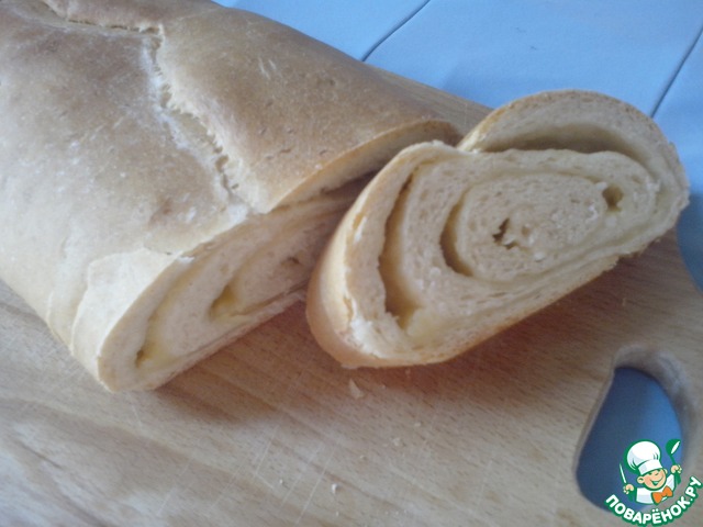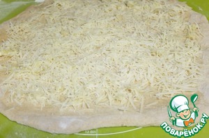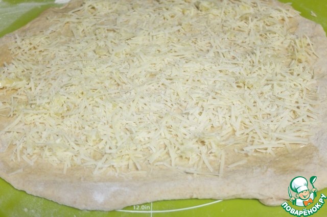 Выкладываем сыр с чесноком на тесто и сворачиваем тесто рулетом.