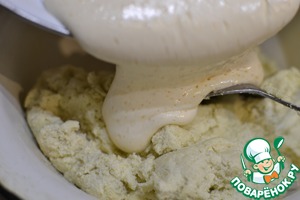 Добавляем сахарно-яичную массу в манку, добавляем растопленное масло, соду и тщательно перемешиваем. Делим тесто на 3 части.