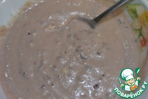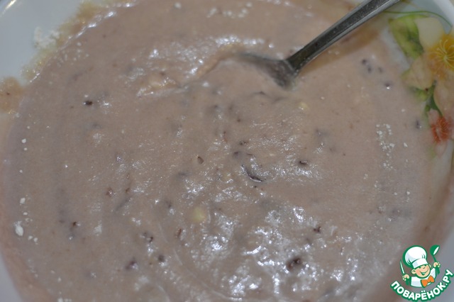 В другую часть-вишневое пюре, если покажется, что цвет не насыщенный, то можно добавить вишневой жидкости. Теперь в вишневую и белую части вносим по чуть-чуть муки, доводим до консистенции шоколадной массы. Тесто должно быть не густым. У меня ушло примерно 30г муки. Но все зависит от качества муки и манки.