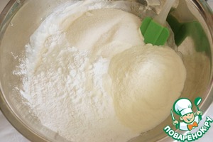 Далее добавляем два вида крахмала, (не советую заменять одним, так как эти два крахмала имеют разные свойства, соответственно каждый выполняет свою роль в начинке), добавляем 100 гр. сахара и сухое молоко.
