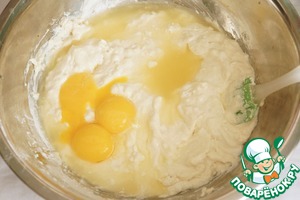 Слегка перемешиваем и добавляем желтки, лимонный сок. Перемешиваем как следует, можно слегка взбить миксером или погружным блендером.