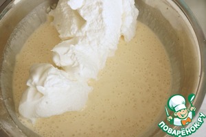 Теперь в 3-4 приема добавляем взбитые белки, каждый раз тщательно их вмешивая строго в одном направлении и снизу вверх. Получается очень нежная, воздушная масса. Вэ то время нужно поставить духовку на разогрев до 250 (240) градусов.