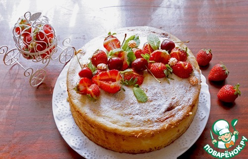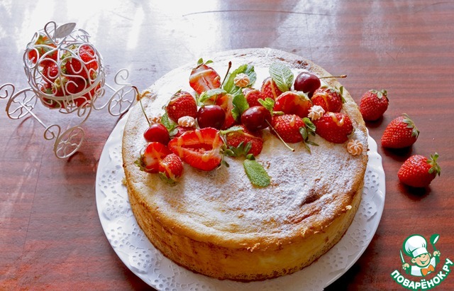 Остывший чизкейк извлекаем из формы, аккуратно проводя ножом по краю. Украшаем сахарной пудрой и ягодками по желанию.