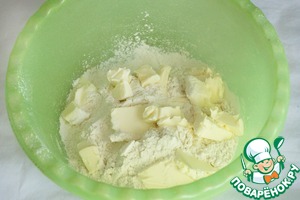 Муку просеять. Добавить нарезанное кусочками масло и стереть все в крошку, удобно это делать вилкой.