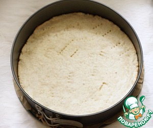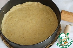 Классически рекомендуется тесто убрать в холод на 1 час. Мне же удобнее делать так. В разъемную форму, диаметром 24 см. на дно положить бумагу для выпечки, распределить тесто по форме и убрать в холодильник на 30 минут.