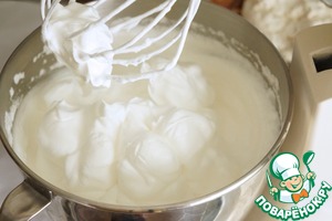 Белки взбиваем в крепкую пену примерно 6-8 минут, у меня миксер взбил за 3 минуты. Постепенно подсыпаем к ним 130 гр. сахара, продолжаем взбивать до крепких пиков. Убираем пока в холодильник.