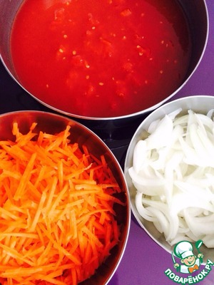 Томаты очистить от кожуры, измельчить. Можно конечно превратить их в пюре в блендере, но я предпочитаю нарезать их средними кусочками.