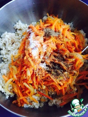 Если булгур впитал всю воду и назначенные ему 30 минут прошли - добавить к нему овощи, по щепотке кориандра, крупного черного перца, орегано и соль по вкусу, но пересол булгуру не к чему.