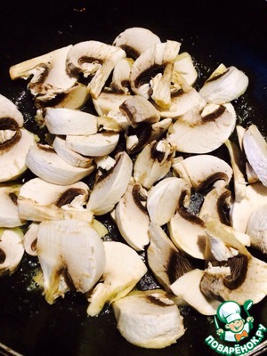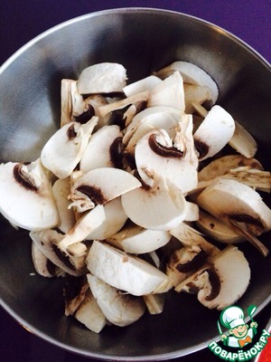 Шампиньоны почистить, нарезать вдоль на 10-12 долек, в зависимости от величины грибов, главное не очень мелко.