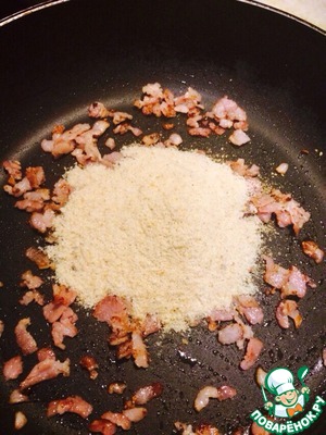 Полоски бекона мелко нарезать и обжарить на сухой и хорошо прогретой сковороде около 3 минут. Добавить хлебную крошку или сухари, перемешать. Если бекон не достаточно жирный и крошка осталась совсем сухой - добавить ложку масла, любого. Смешать и добавить по вкусу и предпочтениям: порошковый или гранулированный чеснок, сухой тимьян или базилик, но не черный перец.