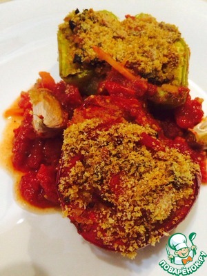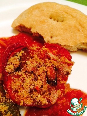 Булгур с обжаренными овощами и грибами, под ароматной хлебной корочкой, запеченный в перце на томатной подушке. Вполне самодостаточное и сытное блюдо.