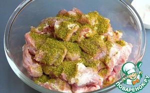 Мясо режем кусочками. Добавляем соль, специи для шашлыка на ваш вкус.