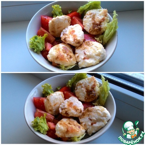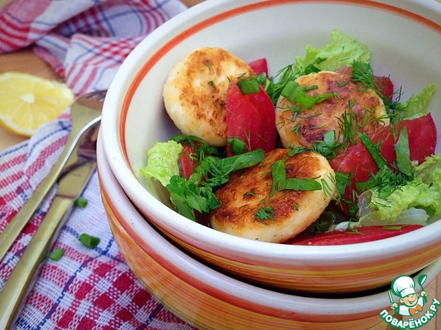 Кто сказал, что сырники только сладкими бывают? Предлагаю вам приготовить соленые сырники и добавить их к свежему салату. Это замечательный тандем. В жаркую погоду, такой салат будет превосходным завтраком или обедом, да и на ужин приготовить его будет приемлемым. Видела этот салат мельком в какой-то телевизионной передаче, состав не запомнила, подобрала ингредиенты на свой вкус. Салат получился легким и сытным. Нам очень понравился.