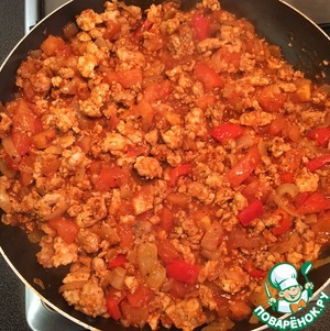 В стакане теплой воды развести 1 ст. л. томатной пасты. Влить к фаршу, приправить соус паприкой, перцем и базиликом, посолить по вкусу, хорошо все перемешать.