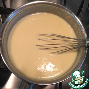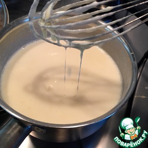 Продолжая мешать соус венчиком вливаем горячее молоко. Нагреваем наш соус, но не кипятим его.
