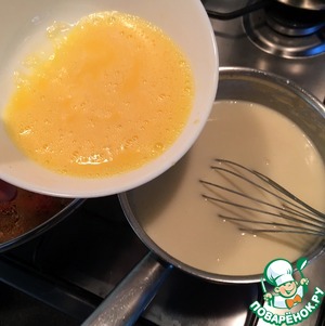 В отдельной миске взбиваем вилкой 2 яйца. Тонкой струйкой вливаем яица в соус, не переставая мешать венчиком.