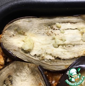 Повторяем слой мясного соуса и остатки баклажанов. Чеснок пропускаем через пресс и выкладываем на баклажаны.
