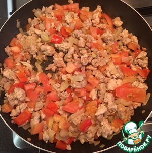 Помидоры обдать кипятком, снять кожицу, нарезать кубиком. Перец болгарский так же нарезать кубиком. Отправить помидоры и перец в сковороду к фаршу. -