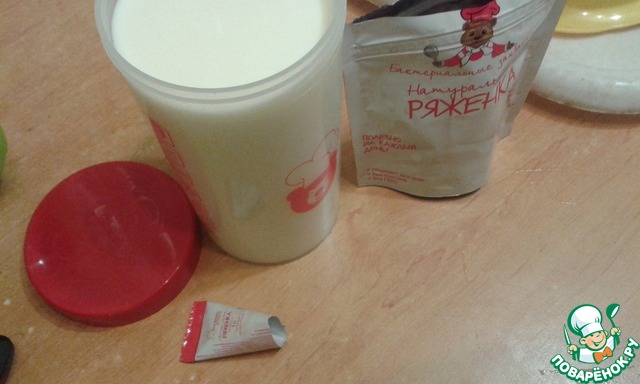 Сначала приготовим вкуснейшую ряженку. Для этого в молоко комнатной температуры нужно всыпать пакетик закваски
