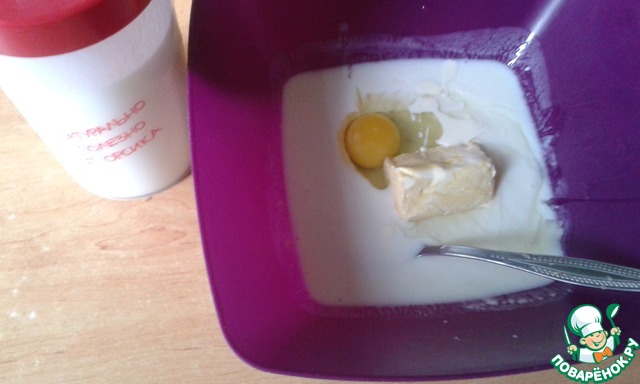 Затем в 250 мл теплой получившей ряженки растворить дрожжи с сахаром и солью. Добавить яйцо, мягкое масло