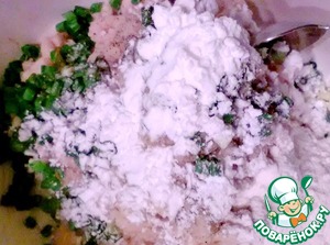 Так же добавляем муку, крахмал и нарезанный лук. Солим. -