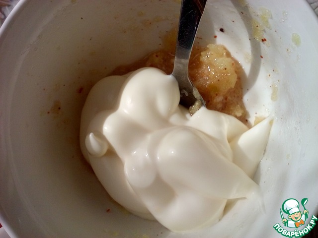 Чеснок раздавить в чеснокодавке или очень мелко порубить ножом