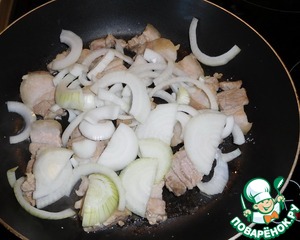 В это время нарезаем грудинку и отправляем ее на сковороду,